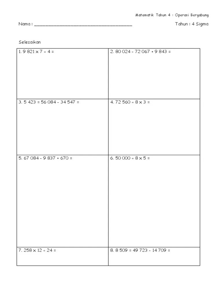 Untuk menyelesaikan suatu operasi bergabung yang melibatkan. 4 · matematik | tahun 4 | operasi bergabung darab & Tp3 • menentukan kewajaran jawapan dan menyelesaikan ayat matematik yang melibatkan operasi asas dan operasi .